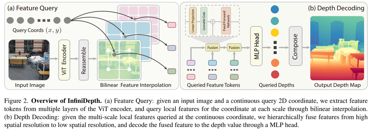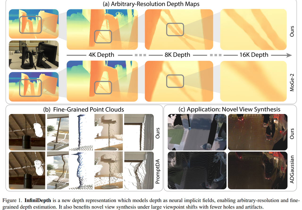 基于这样的观察,浙江大学彭思达团队联合理想研究团队,提出了论文《InfiniDepth: Arbitrary-Resolution and Fine-Grained Depth Estimation with Neural Implicit Fields》。这项工作并未急于在既有框架上追求更高指标,而是从深度的表示方式本身出发,重新思考高分辨率条件下深度应如何被建模和使用。