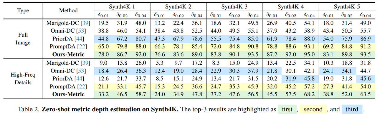 在尺度深度估计实验中,研究团队将 InfiniDepth 与稀疏深度提示机制结合,并在 Synth4K 以及真实数据集上采用更严格的 δ0.01、δ0.02 和 δ0.04 指标进行评测。