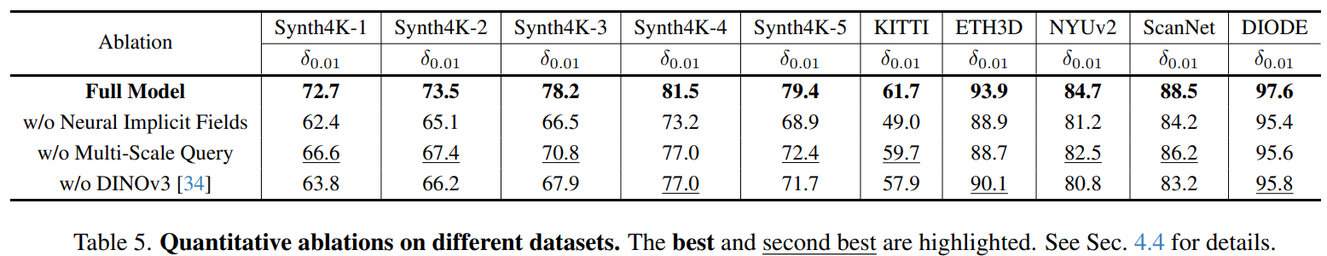 为验证各个模块的贡献,研究团队进一步设计了系统的消融实验。当移除连续深度表示、回退到传统离散网格预测方式时,模型在 Synth4K 和真实数据集上的高精度指标普遍下降 8 到 12个百分点;当去除多尺度局部特征查询与融合机制时,模型在细节区域的性能同样出现一致性退化。这些结果从定量角度证明,连续表示和多尺度局部查询是 InfiniDepth 性能提升的关键因素。