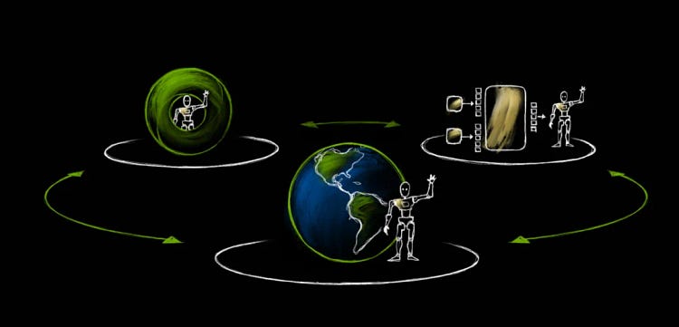 第二台计算机,是仿真计算机(Simulation Computer)。这是英伟达这两年最激动人心的部分,由 Omniverse 和 Isaac Sim 驱动。现实世界的数据太贵、太慢、太有限,而仿真世界没有这些限制。AI 可以在虚拟空间里无数次地试错、生成数据、重来一遍又一遍,在那里,它能学会如何看世界、怎么动手、怎么反应。你可以把它想成 AI 的练功房,它在那里摸爬滚打、不断升级。