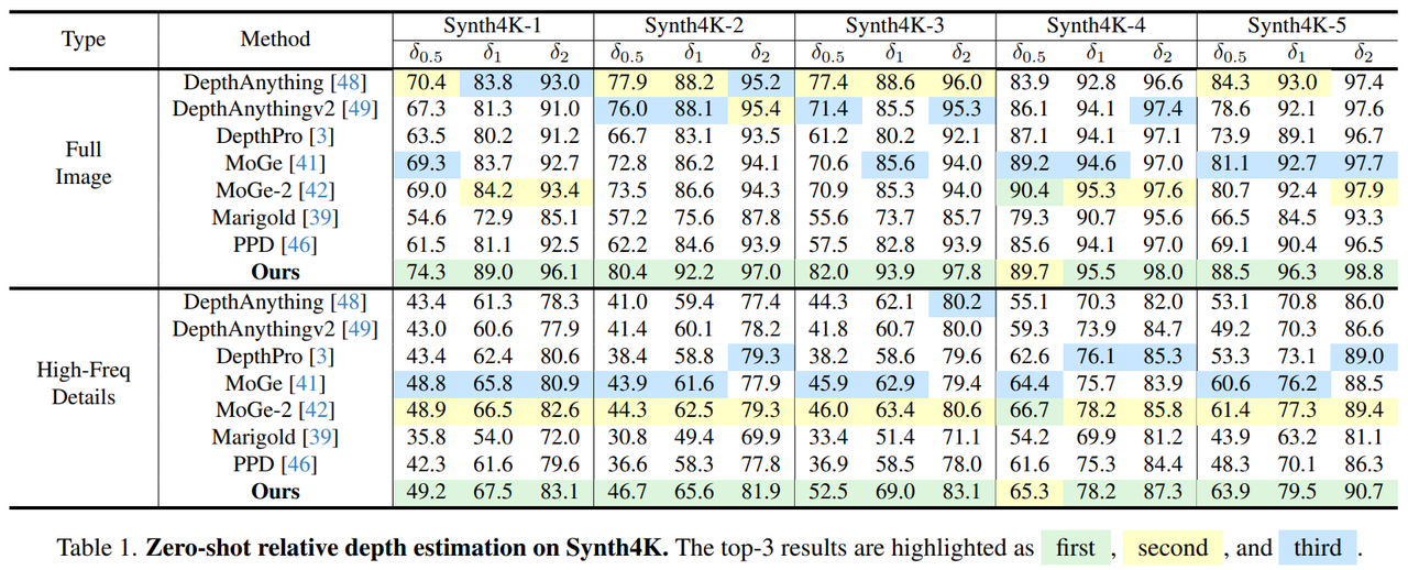 首先,在研究团队构建的 Synth4K 数据集上,对模型进行了零样本相对深度评测。Synth4K 由五个子数据集组成,分别来自不同高质量游戏场景,每个子集包含数百张分辨率为 3840×2160 的 RGB 图像及对应高精度深度图,能够真实反映高分辨率场景中的边缘结构、薄物体以及复杂曲面。