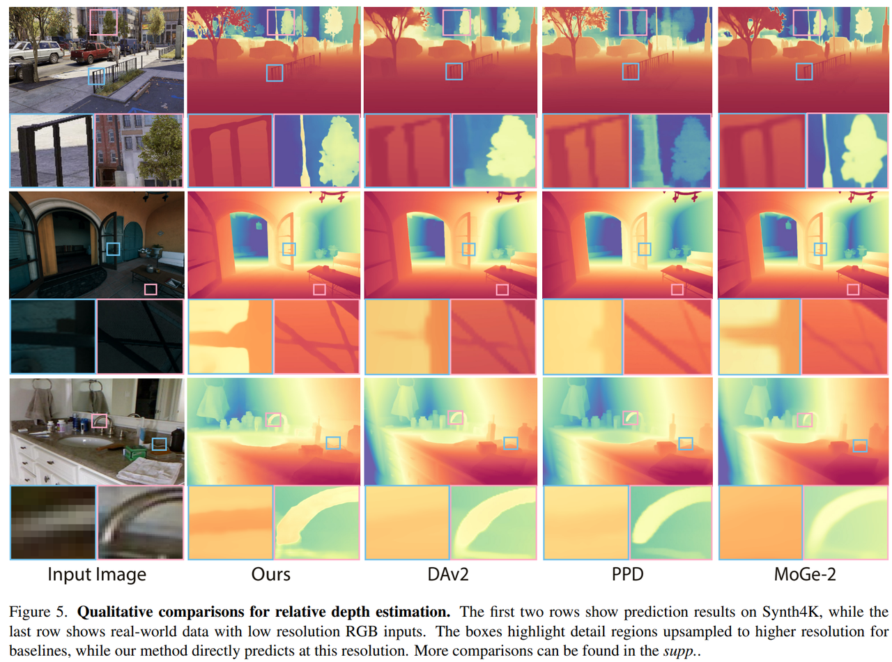 一个很重要的原因在于,现有方法大多仍在固定分辨率下预测深度,再通过插值将结果放大到更高分辨率。这样做虽然能够得到更大的输出尺寸,但在细节区域,本质上只是放大了原有的预测误差。