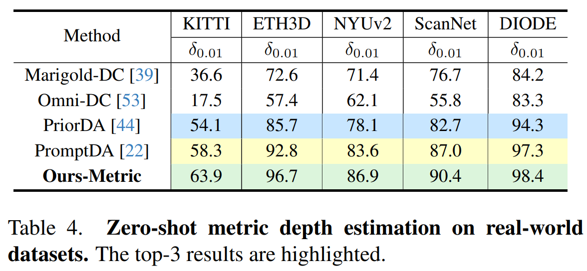 在尺度深度估计实验中,研究团队将 InfiniDepth 与稀疏深度提示机制结合,并在 Synth4K 以及真实数据集上采用更严格的 δ0.01、δ0.02 和 δ0.04 指标进行评测。