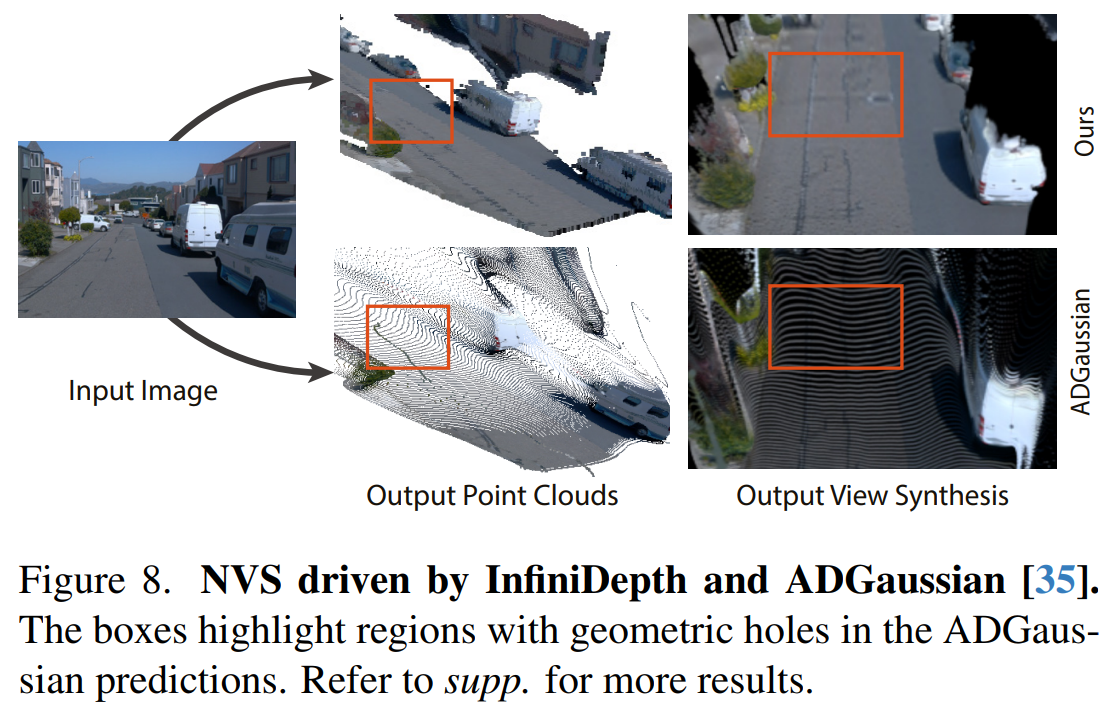 这种更可靠的三维几何结构不仅有利于视觉重建和渲染任务,在自动驾驶和机器人系统中同样具有现实意义。更准确的空间几何信息有助于系统对周围环境形成更清晰的空间认知,从而为后续的导航规划与决策提供更加稳定的感知支撑。
