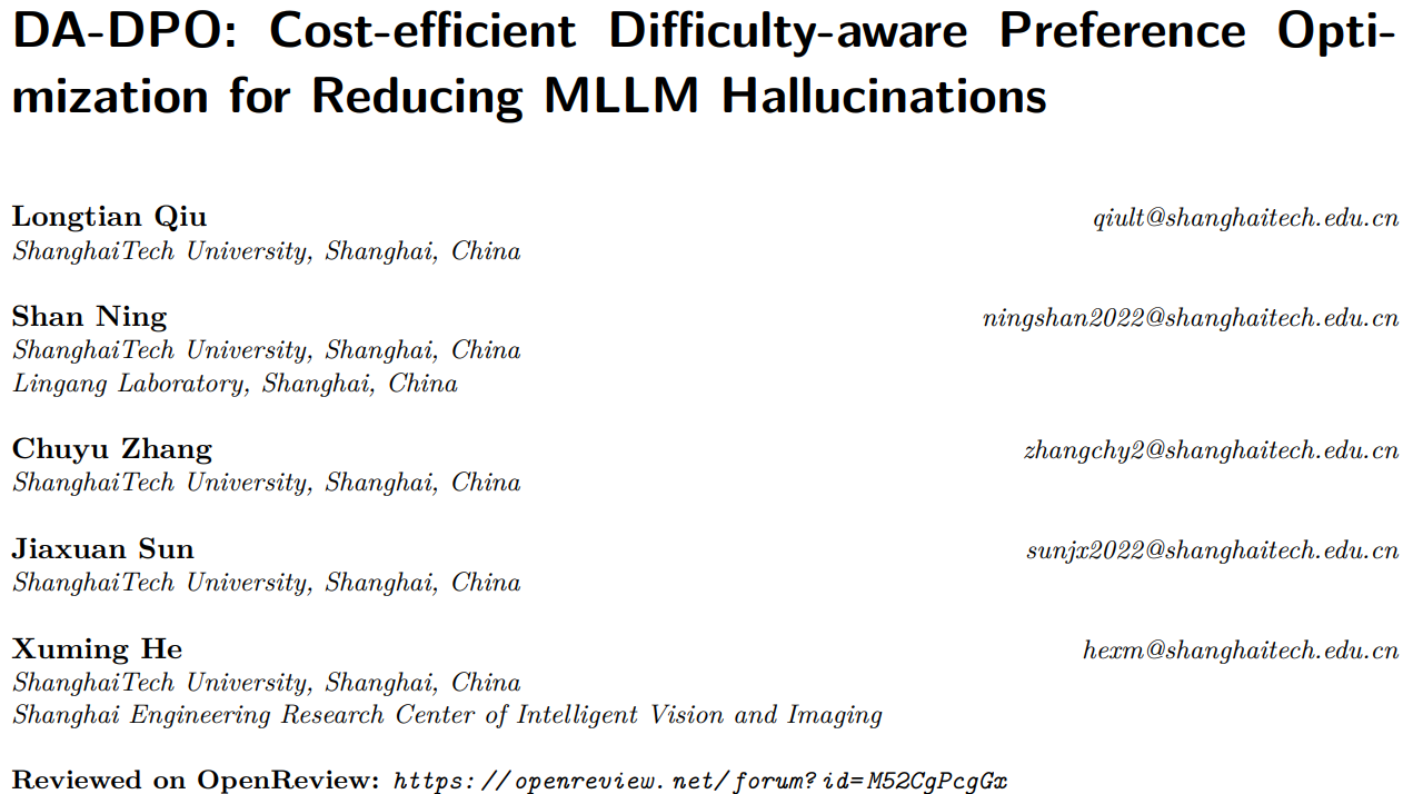 围绕这一问题,上海科技大学信息科学与技术学院何旭明教授带领团队在论文《DA-DPO: Cost-efficient Difficulty-aware Preference Optimization for Reducing MLLM Hallucinations》中开展了系统研究。这项工作指出,现有偏好优化方法的核心症结不在于数据规模的不足,而在于样本难度分布失衡。