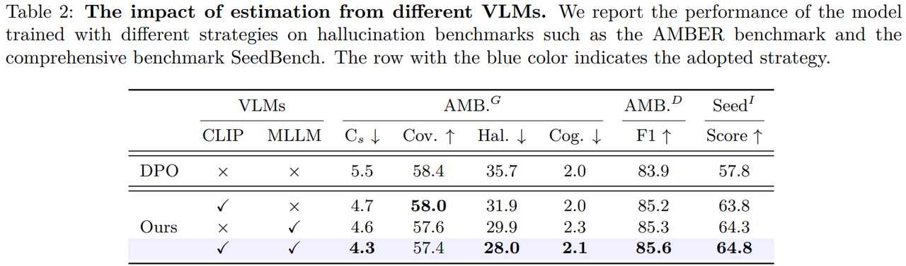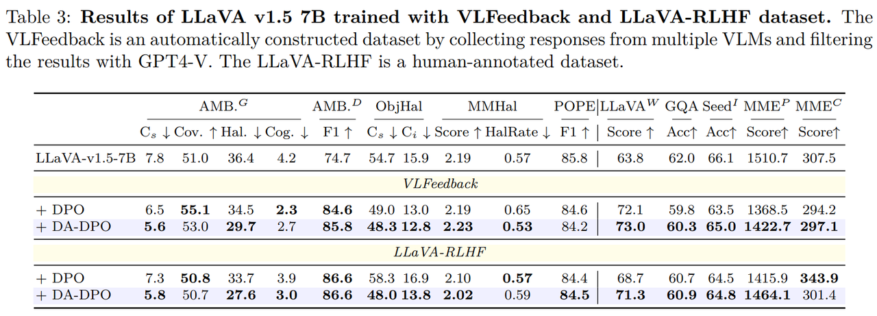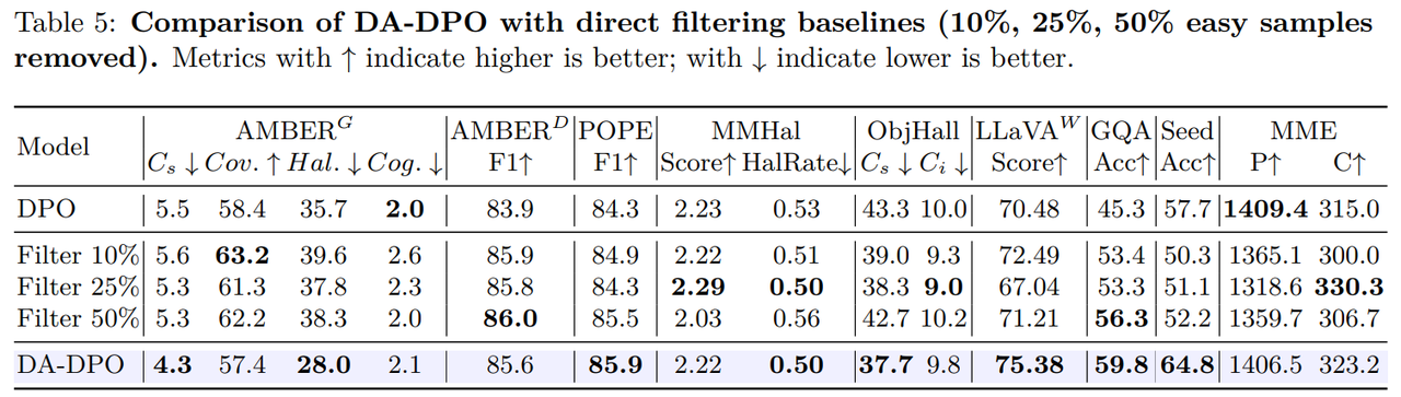 最终的实验结果表明,研究团队提出的 DA-DPO 方法在降低多模态大语言模型幻觉现象方面实现了稳定而显著的改进,同时在保持甚至提升模型综合能力方面也展现出明显优势。