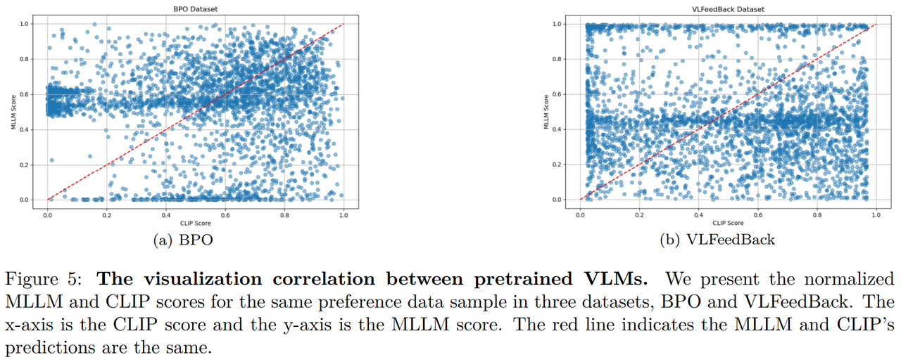 在数据层面,团队并未依赖单一偏好数据集,而是综合使用了三类来源不同的数据:BPO 自动构造数据(通过弱化图像与注入错误生成负样本)、VLFeedback 自动偏好数据(由多模型生成回答并经 GPT-4V 评分筛选)以及 LLaVA-RLHF 人工标注数据。跨数据源的实验设计旨在验证样本难度不平衡是偏好数据中的普遍现象,而非个别数据集的偶然结果。