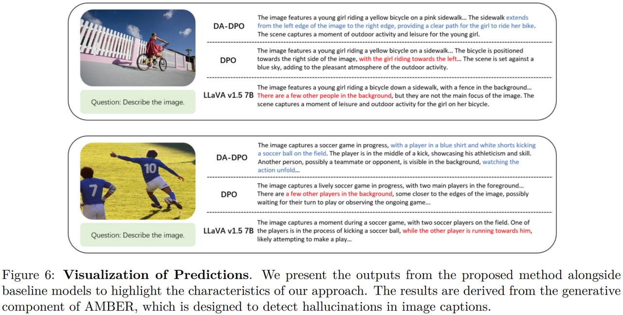 在这些评测中,与原始模型和传统 DPO 方法相比,DA-DPO 在降低幻觉率和提升事实一致性两方面均表现出显著提升。例如,在针对物体幻觉的测试中,模型明显减少了对图像中并不存在物体或属性的臆造描述,尤其在复杂场景和存在遮挡的情况下,DA-DPO 对随意性、想象式回答的抑制效果更加突出。
